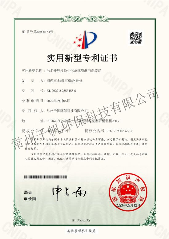 實用新型專利證書 污水處理設備生化系統噴淋消泡裝置